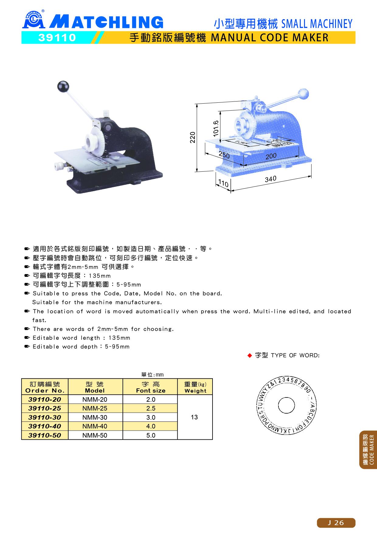 ● 適用於各式銘版刻印編號,如製造日期、產品編號··等。● 壓字編號時會自動跳位,可刻印多行編號,定位快速。● 輪式字體有2mm-5mm可供選擇。● 可編輯字句長度:135mm● 可編輯字句上下調整範圍:5-95mm