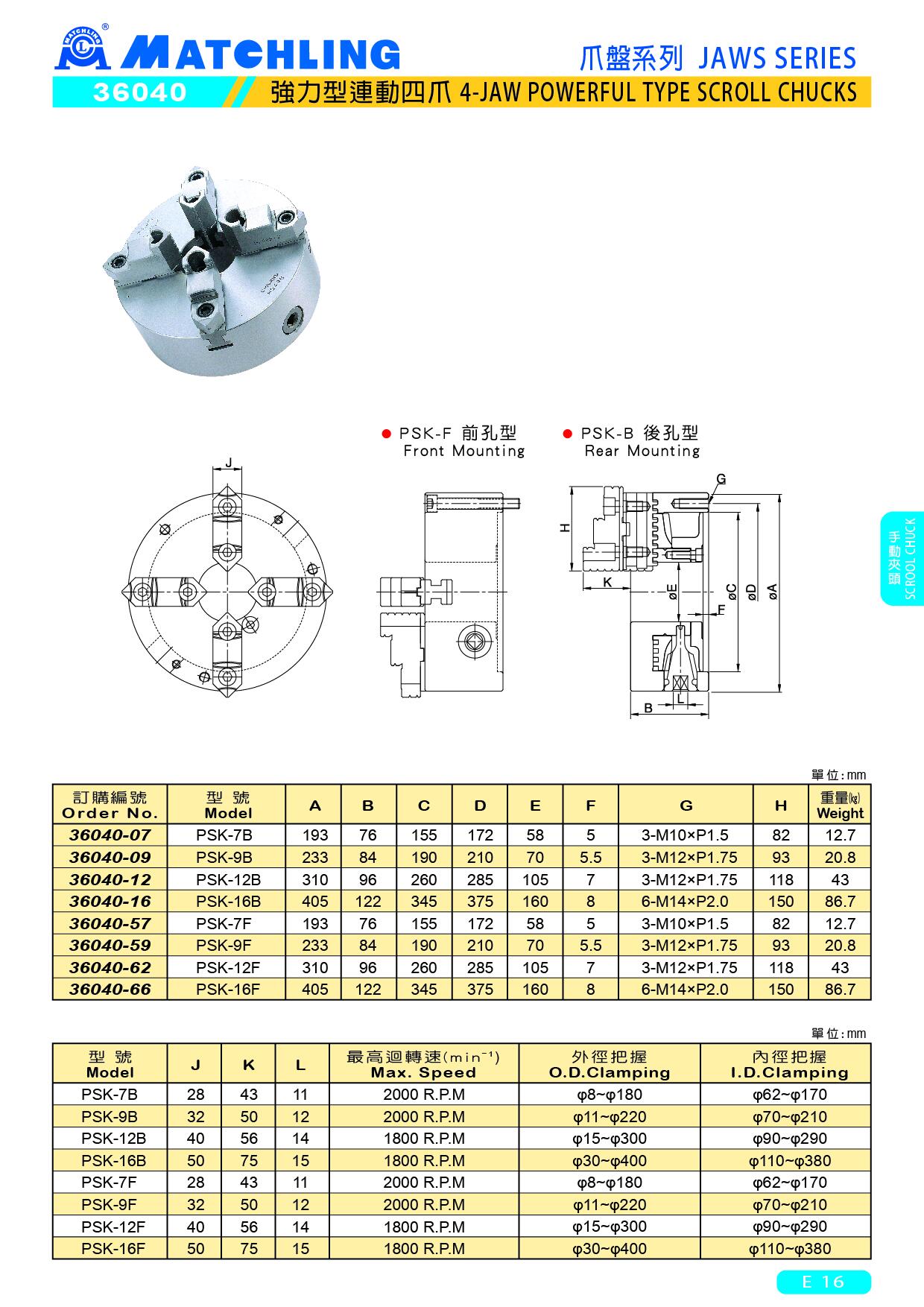 | PSK-16F | 50 | 75 | 15 | 1800 R.P.M | φ30~φ400 | φ110~φ380 | |||||||||