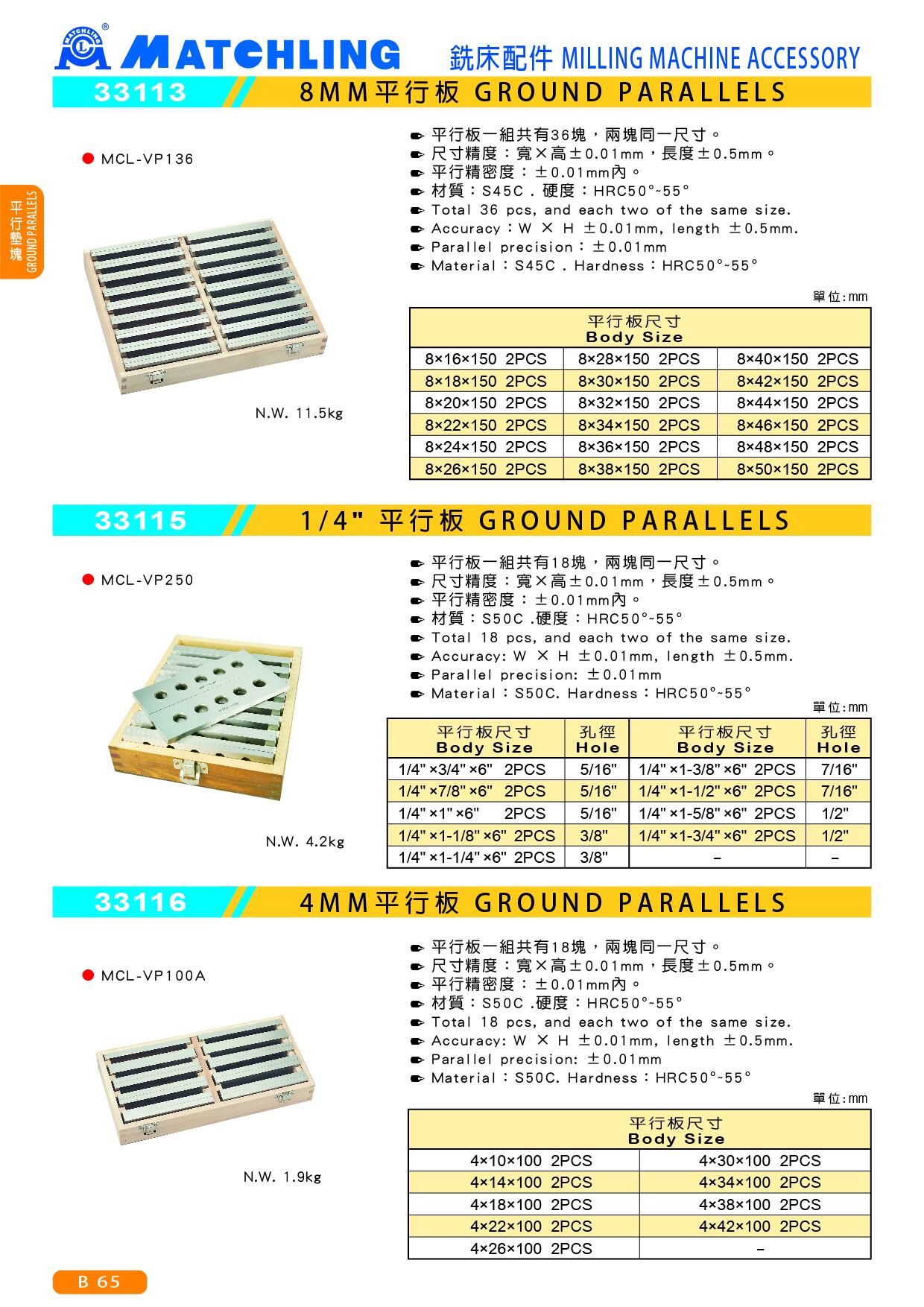 ● 平行板一組共有18塊,兩塊同一尺寸。● 尺寸精度:寬×高±0.01mm,長度±0.5mm。● 平行精密度:±0.01mm內。● 材質:S50C .硬度:HRC50°~55°● 重量 N.W.:1.9kg