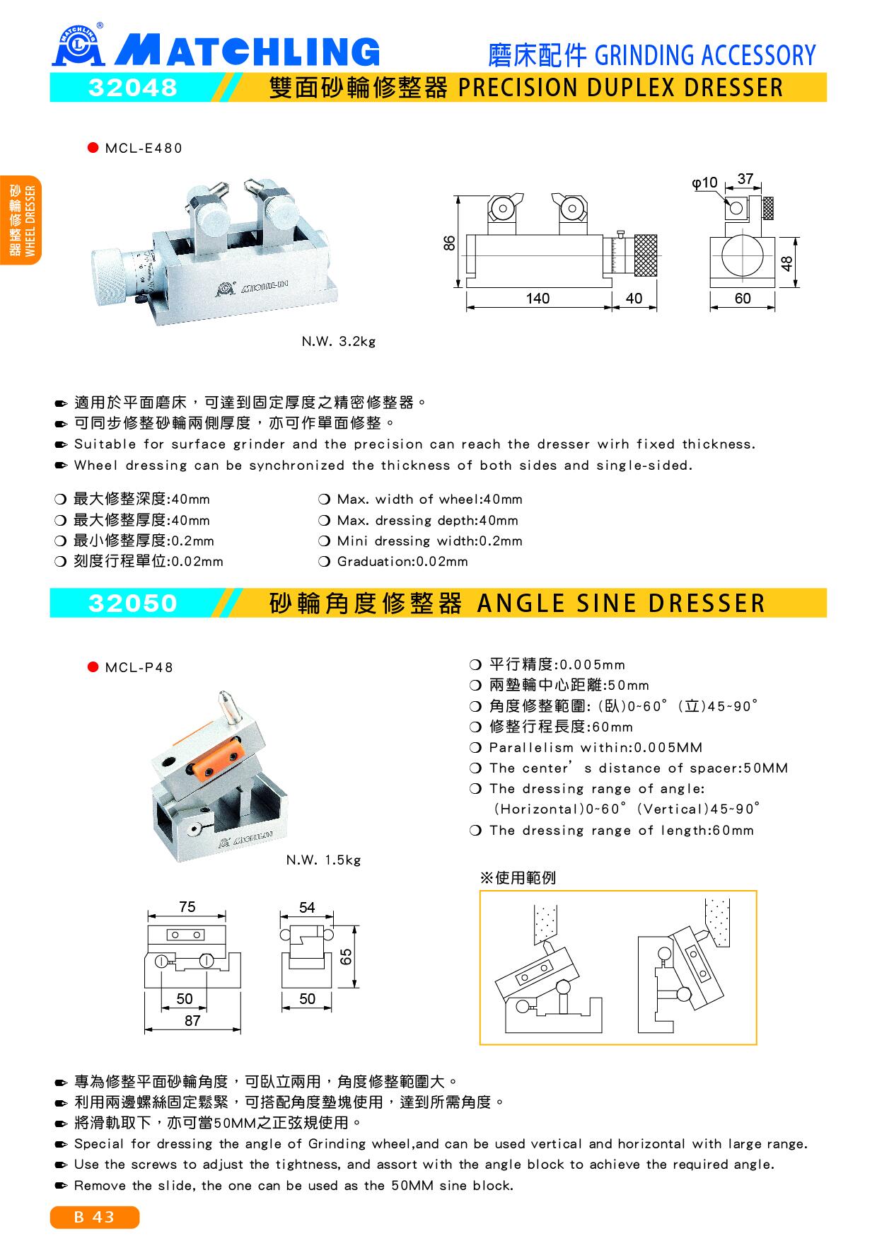 ● 專為修整平面砂輪角度,可臥立兩用,角度修整範圍大。● 利用兩邊螺絲固定鬆緊,可搭配角度墊塊使用,達到所需角度。● 將滑軌取下,亦可當50MM之正弦規使用。■ 規格:● 平行精度:0.005mm● 兩墊輪中心距離:50mm● 角度修整範圍: (臥)0~60°(立)45~90°● 修整行程長度:60mm● 重量:1.5kg■ 配件:1. 鑽石筆1支