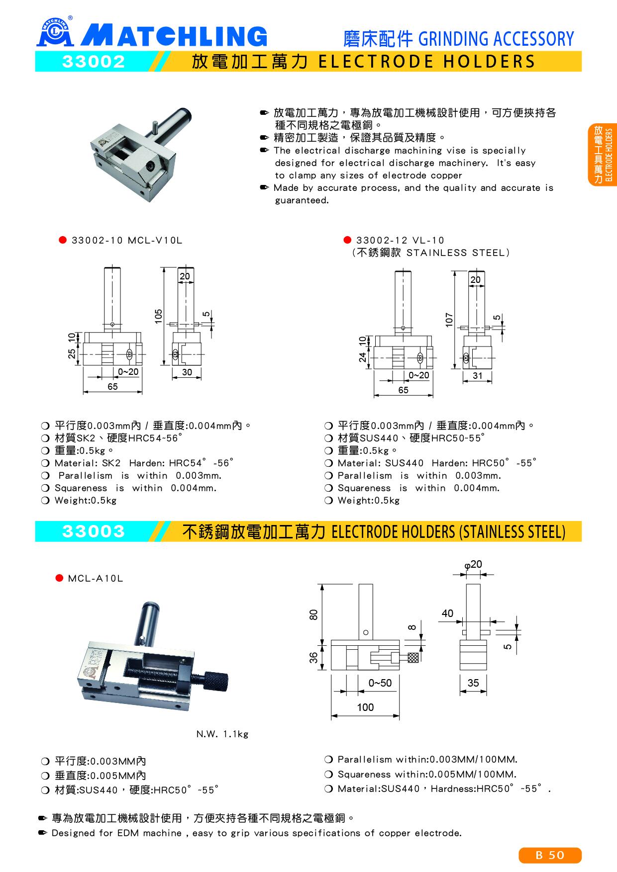 ● 放電加工萬力,專為放電加工機械設計使用,可方便挾持各種不同規格之電極銅。● 精密加工製造,保證其品質及精度。■ MCL-V10L 規格:● 平行度0.003mm內 / 垂直度:0.004mm內。● 材質SK2、硬度HRC54~56° ● 重量:0.5kg。■ VL-10 (不銹鋼) 規格:● 平行度0.003mm內 / 垂直度:0.004mm內。● 材質SUS440、硬度HRC50~55° ● 重量:0.5kg。
