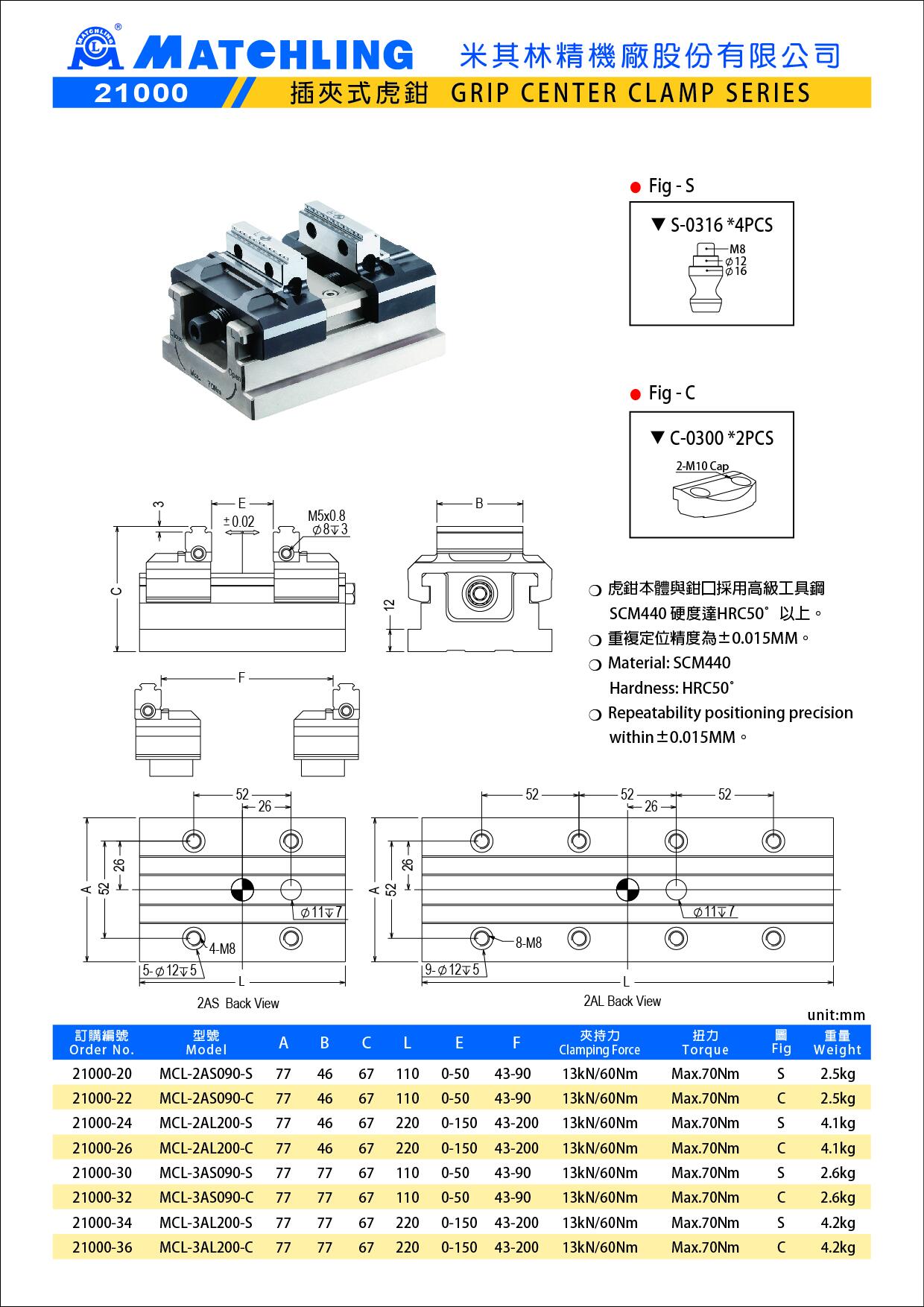 | 21000-34 | MCL-3AL200-S | 77 | 77 | 67 | 220 | 0-150 | 43-200 | 13kN/60Nm | Max.70Nm | S | 4.2 |