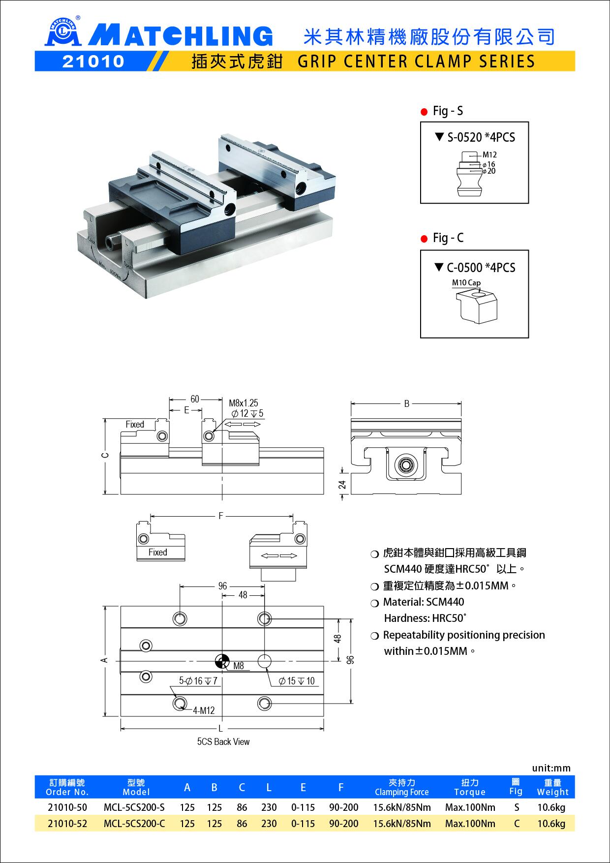 | 21010-50 | MCL-5CS200-S | 125 | 125 | 86 | 230 | 0-115 | 90-200 | 15kN/85Nm | Max.100Nm | S | 10.6 |