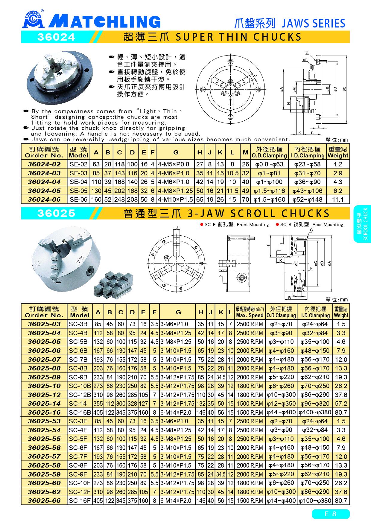 | 36025-04 | SC-4 | 112 | 58 | 80 | 95 | 24 | 4.5 | 3-M8xP1.25 | 42 | 14 | 17 | 8 | 2500 R.P.M | φ3~φ90 | φ32~φ84 | 3.3 |