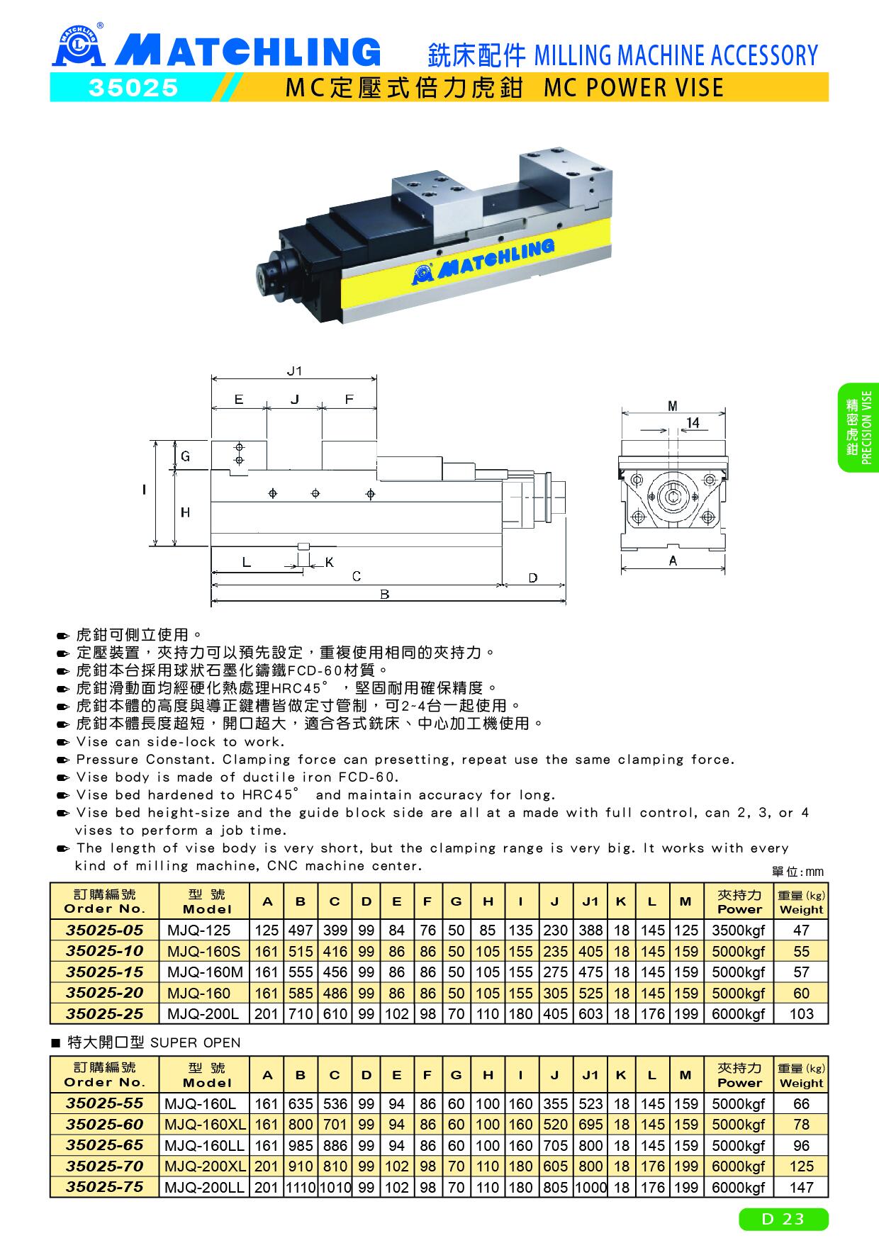 | 訂購編號 | 型號 | A | B | c | D | E | F | G | H | 1 | J | J1 | K | L | M | 夾持力 | 重量 (kg) |