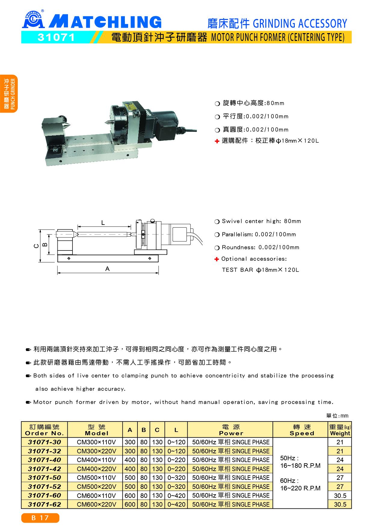 | 31071-30 | CM300×110V | 300 | 80 | 130 | 0 ~ 120 | 50/60Hz 單相 | 50Hz : 16~180 R.P.M 60Hz : 16~220 R.P.M | 21 |