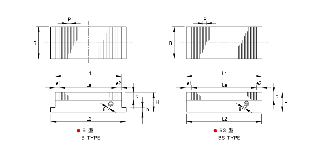 | B | L1 | Le | H | t | e1 | e2 | P | L2 | h | |||