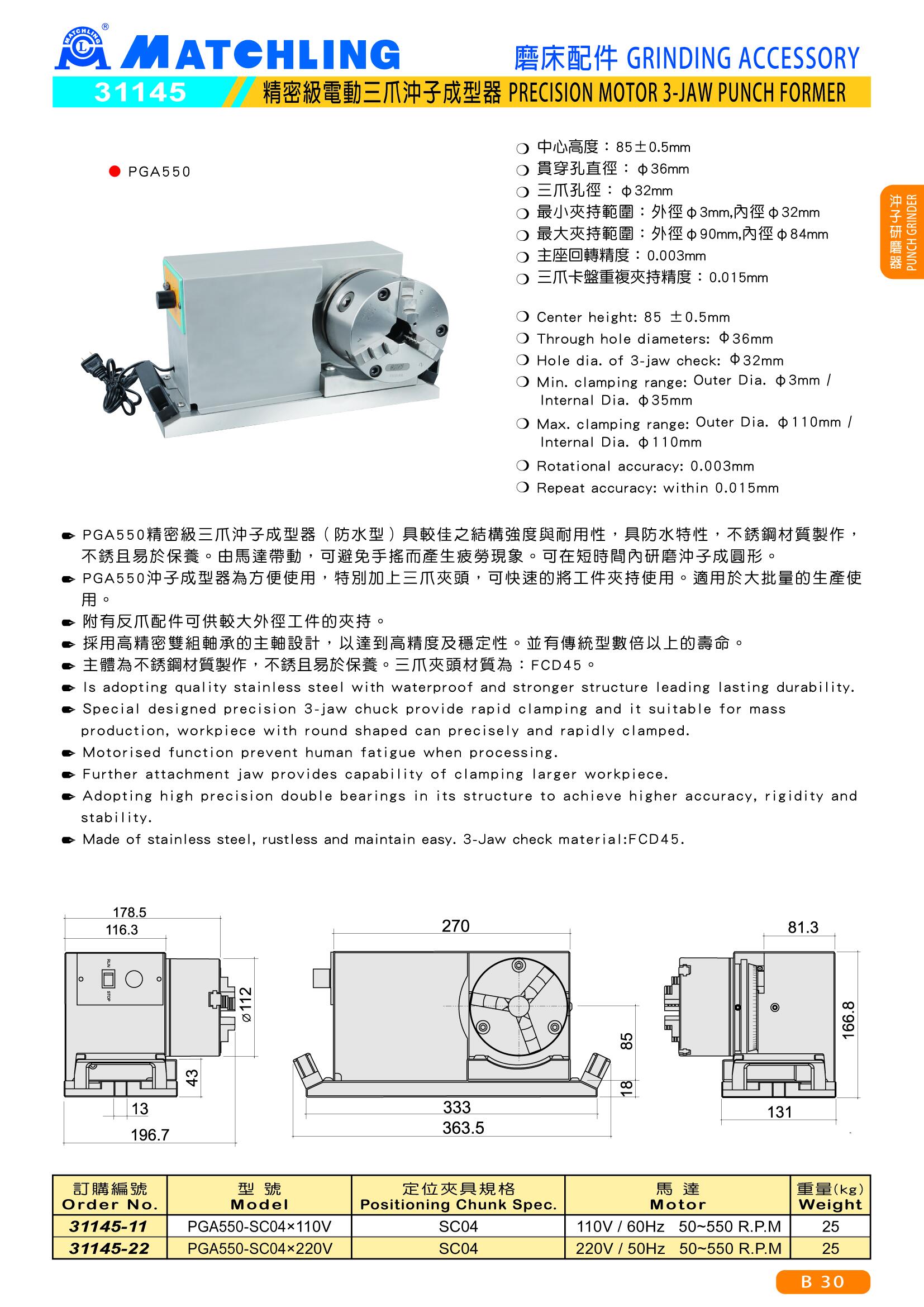 ● PGA550沖子成型器為方便使用,特別加上三爪夾頭,可快速的將工件夾持使用。