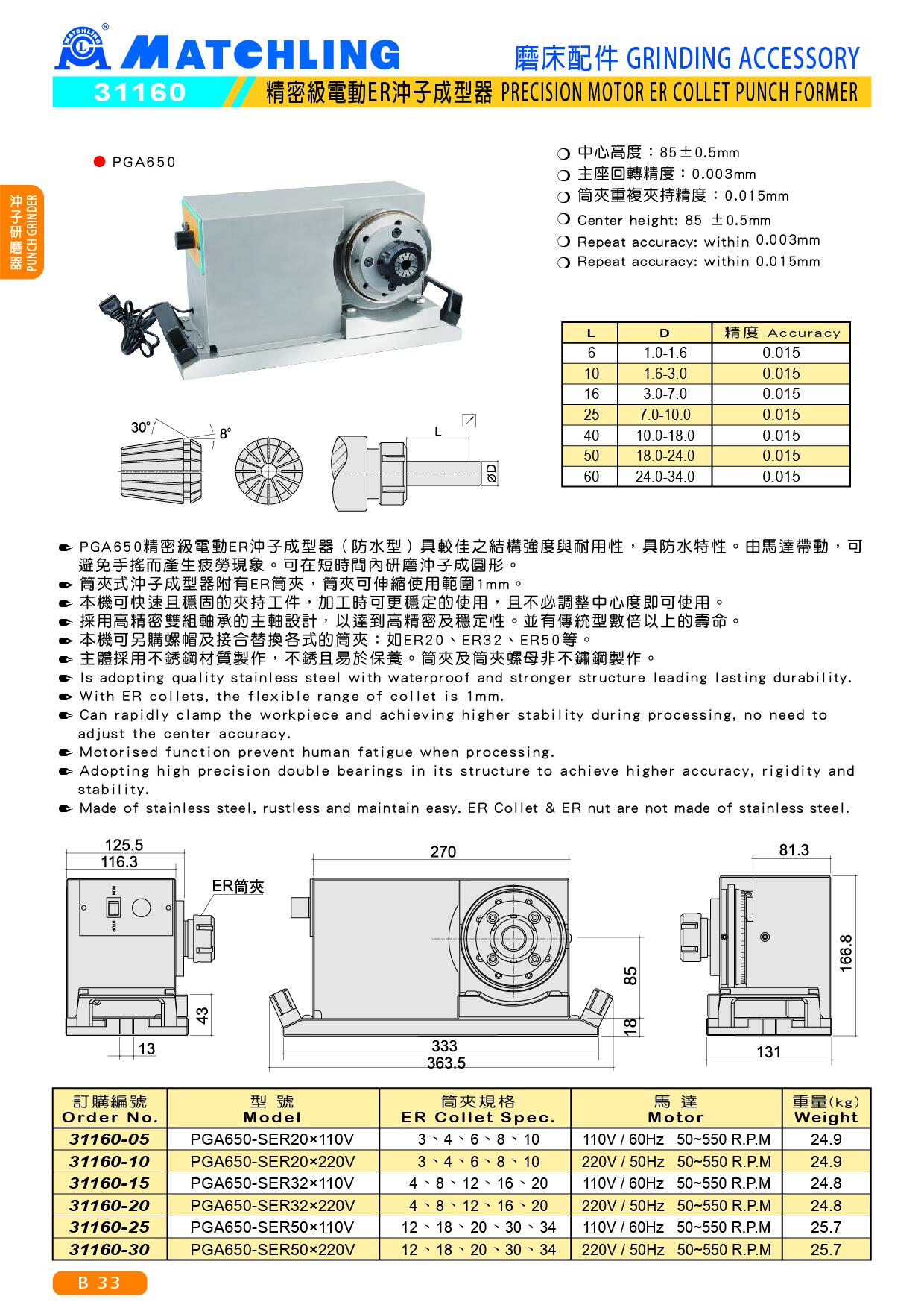 ● PGA650精密級電動ER沖子成型器(防水型)具較佳之結構強度與耐用性,具防水特性。由馬達帶動,可避免手搖而產生疲勞現象。可在短時間內研磨沖子成圓形。