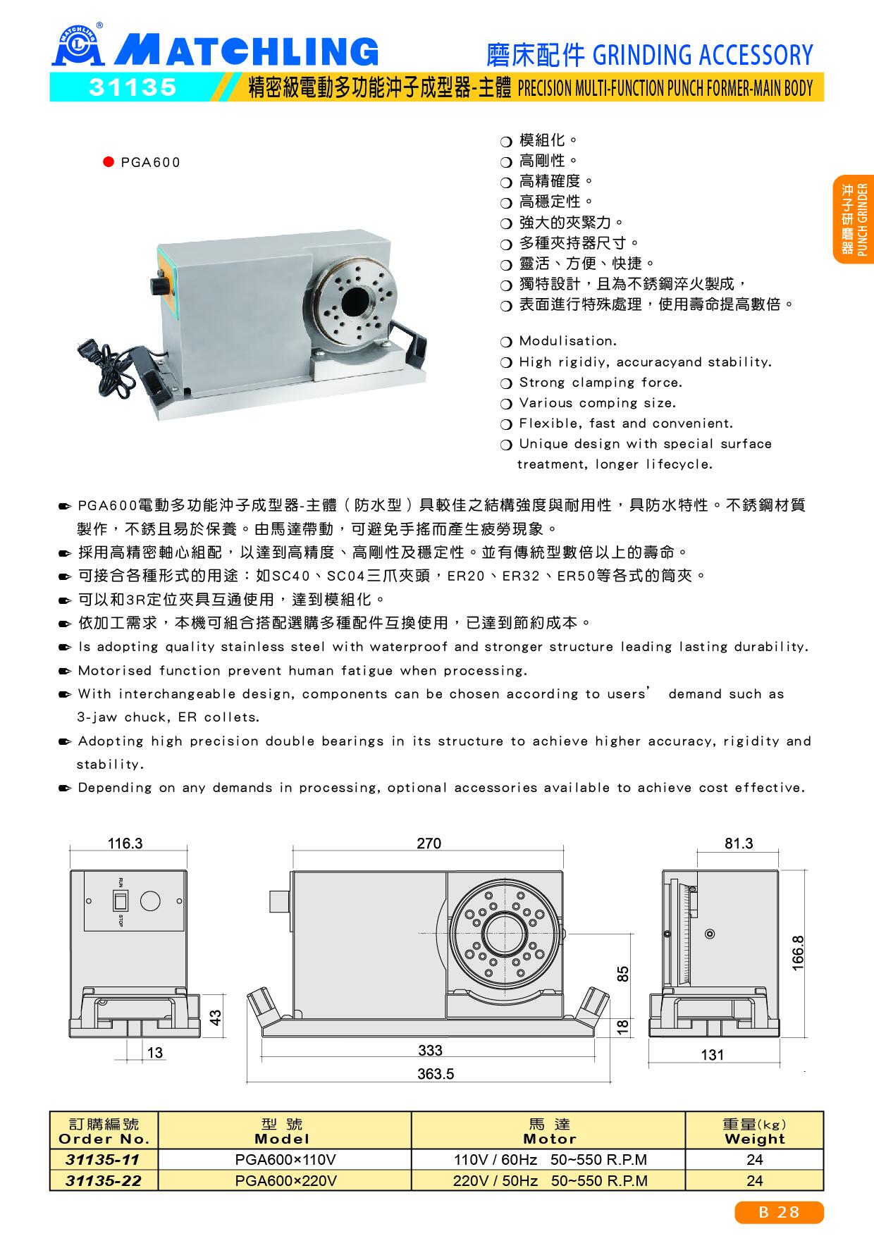 | 31135-11 | PGA600x110V | 110V/60HZ 50~550 R.P.M | 24 |
