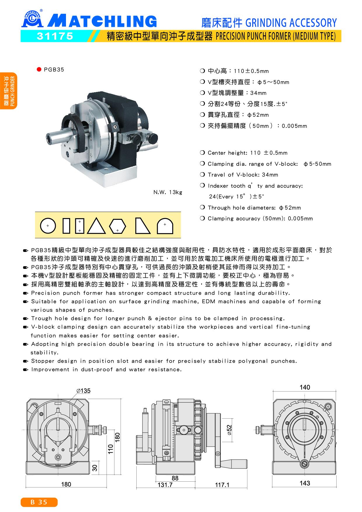 ● PGB35精級中型單向沖子成型器具較佳之結構強度與耐用性,具防水特性,適用於成形平面磨床,對於各種形狀的沖頭可精確及快速的進行磨削加工,並可用於放電加工機床所使用的電極進行加工。
