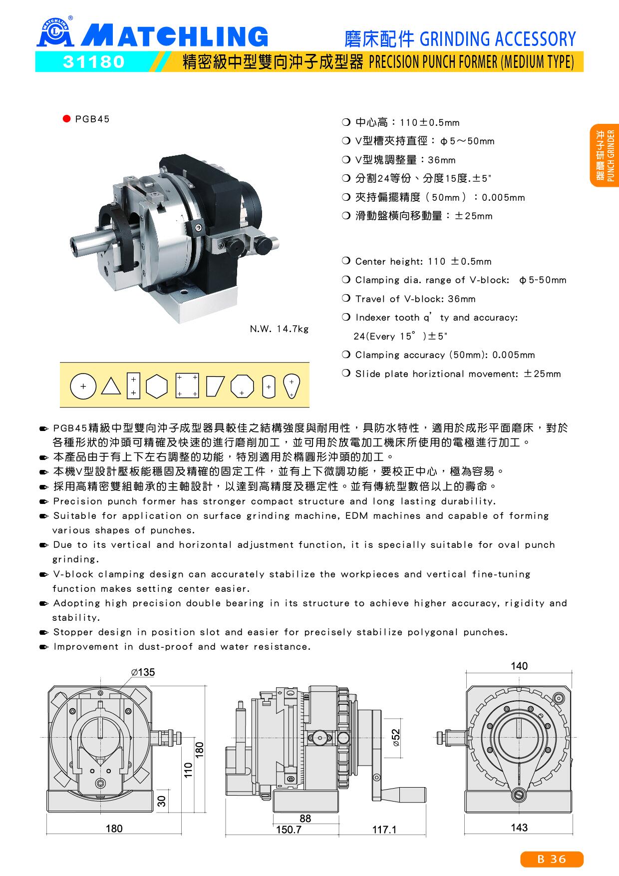 ● PGB45精級中型雙向沖子成型器具較佳之結構強度與耐用性,具防水特性,適用於成形平面磨床,對於各種形狀的沖頭可精確及快速的進行磨削加工,並可用於放電加工機床所使用的電極進行加工。