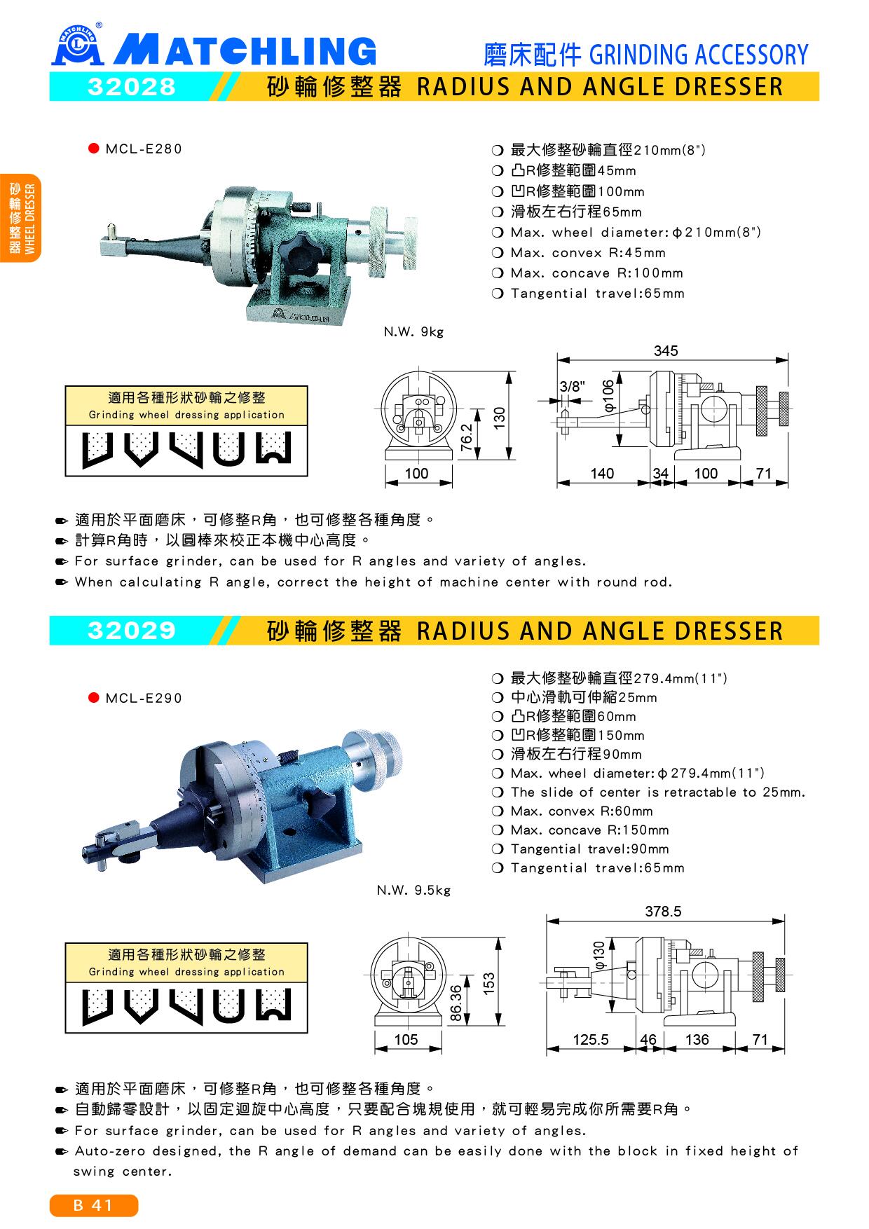 ● 適用於平面磨床,可修整R角,也可修整各種角度。● 計算R角時,以圓棒來校正本機中心高度。■ 規格:● 最大修整砂輪直徑210mm(8")● 凸R修整範圍45mm● 凹R修整範圍100mm● 滑板左右行程65mm● 重量:9kg■ 配件:1. 中心高度標準PIN2. 鑽石筆1支