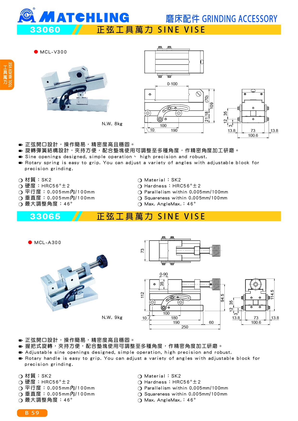 ● 正弦開口設計,操作簡易,精密度高且穩固。● 握把式旋轉,夾持方便,配合墊塊使用可調整至多種角度,作精密角度加工研磨。■ 規格:● 材質:SK2● 硬度:HRC56°±2● 最大調整角度:46°● 平行度:100mm/0.005mm內● 垂直度:100mm/0.005mm內