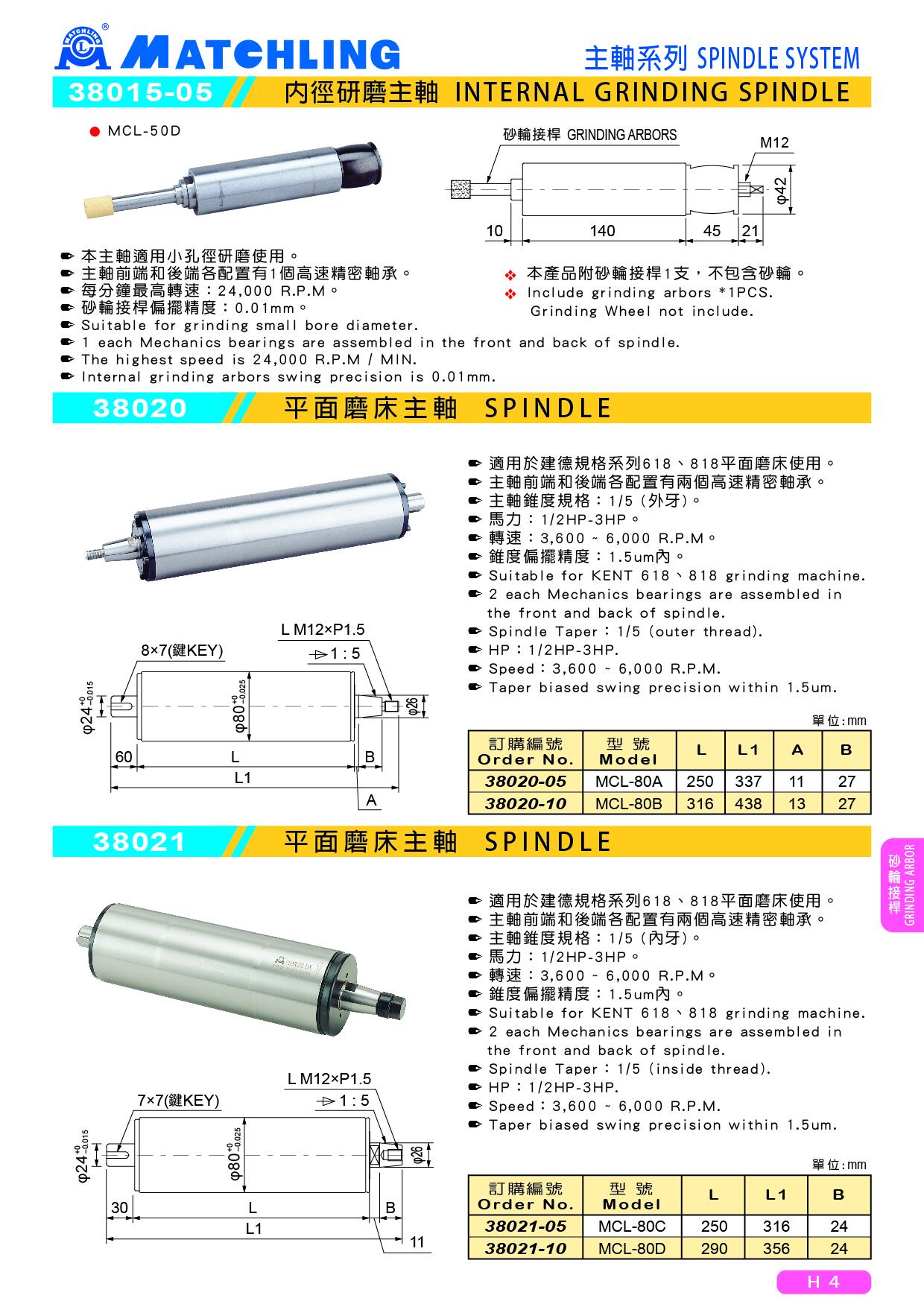 ● 本主軸適用於建德規格系列618、818平面磨床使用。● 主軸前端和後端各配置有兩個高速精密軸承。● 主軸錐度規格:1/5 (外牙)。● 馬力:1/2HP-3HP。● 轉速:3,600 ~ 6,000 R.P.M。● 錐度偏擺精度:1.5um內。