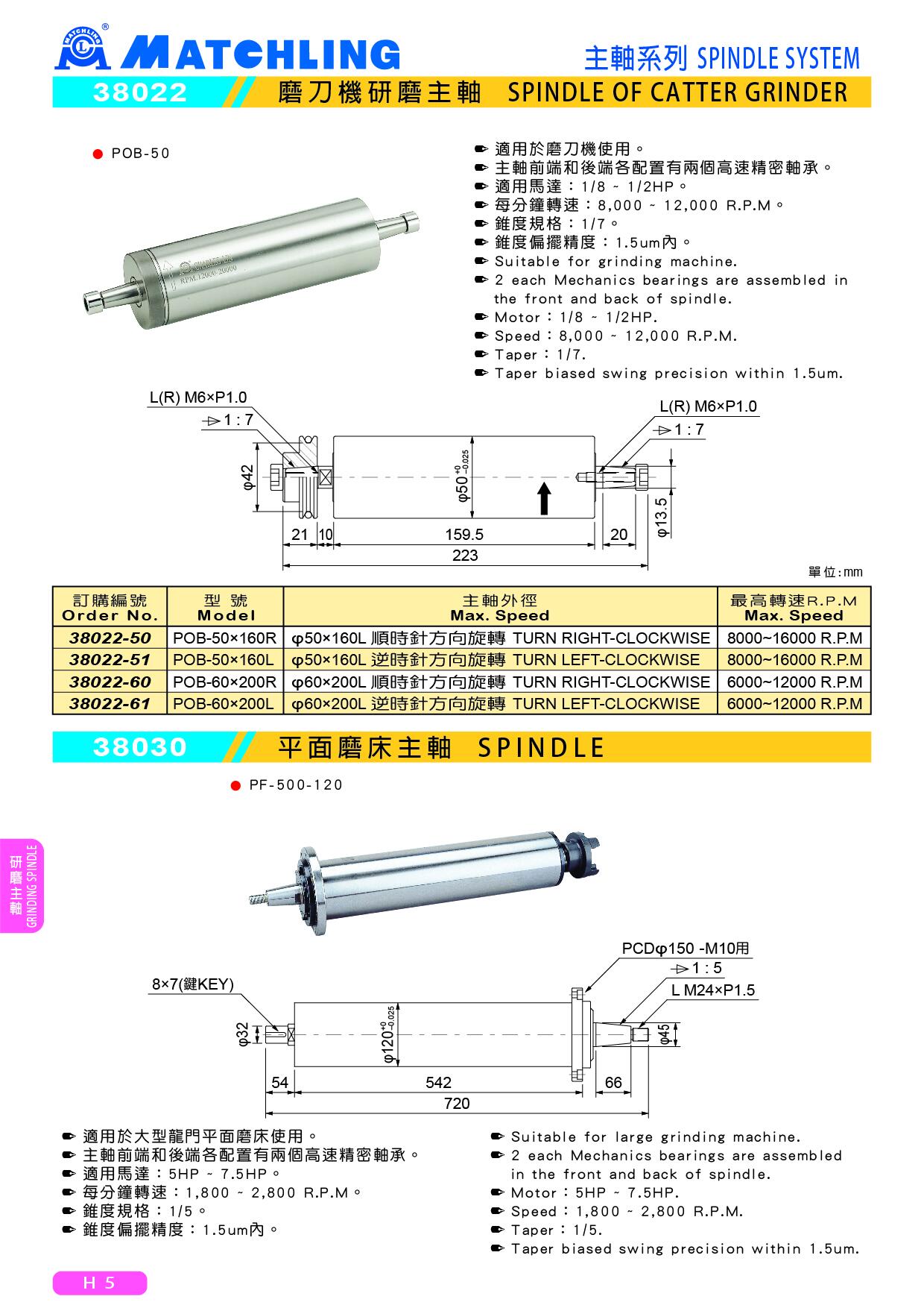 ● 本主軸適用於大型龍門平面磨床使用。● 主軸前端和後端各配置有兩個高速精密軸承。● 主軸適用馬達:5HP ~ 7.5HP。● 每分鐘轉速:1,800 ~ 2,800 R.P.M。● 錐度規格:1/5。● 錐度偏擺精度:1.5um內。