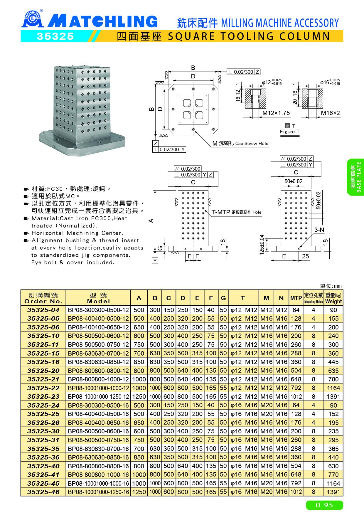 | 訂購編號 | 型號 | A | B | C | D | E | F | G | T | M | N | MTP | 定位孔數 | 重量 (kg) | |