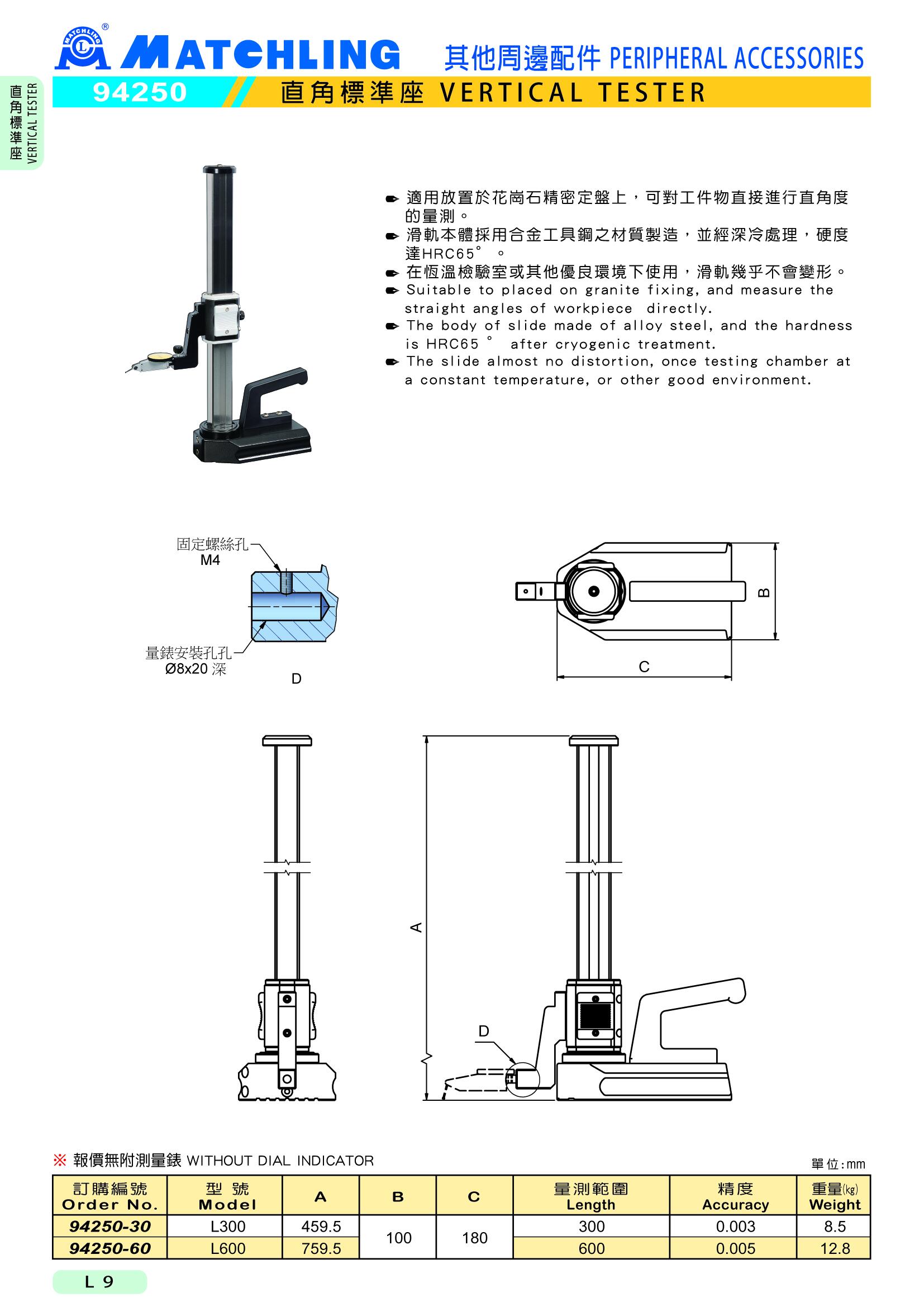 ● 適用放置於花崗石精密定盤上,可對工件物直接進行直角度的量測。● 滑軌本體採用合金工具鋼之材質製造,並經深冷處理,硬度達HRC65°。● 在恆溫檢驗室或其他優良環境下使用,滑軌幾乎不會變形。